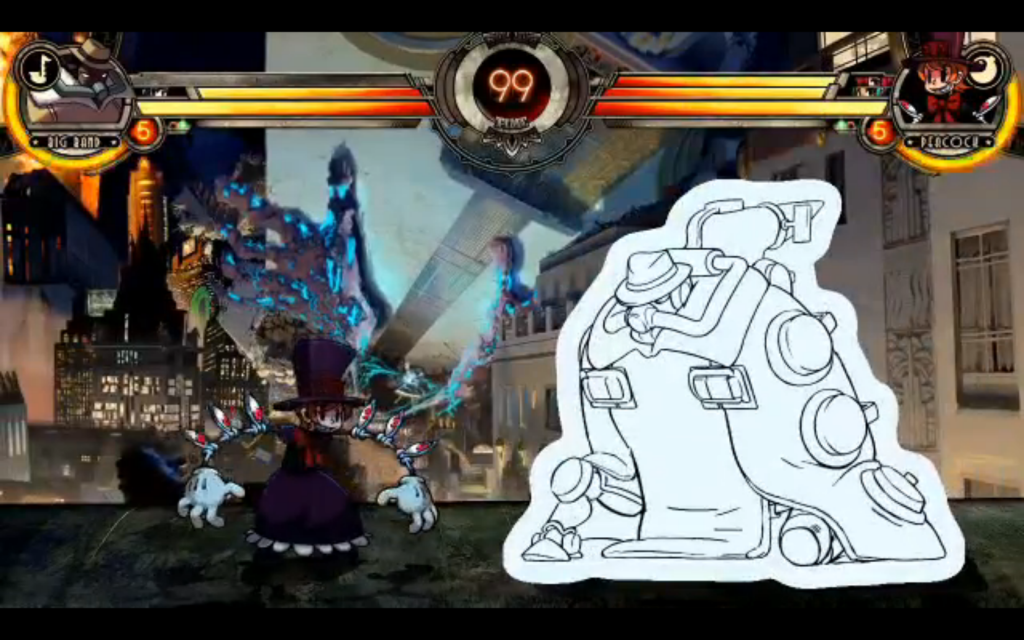 Big Band was the second of five DLC characters funded during the “Keep Skullgirls Growing” IndieGoGo campaign: The first playable male character in the game, Ben Birdland was an officer of New Meridian, given an early, violent retirement from his crooked former unit; his body was reconstructed by the Anti-Skullgirl Labs, with experimental musical weapons and organs. He protects Lab 8 and other Anti-Skullgirl Labs members under the alias “Big Band”.