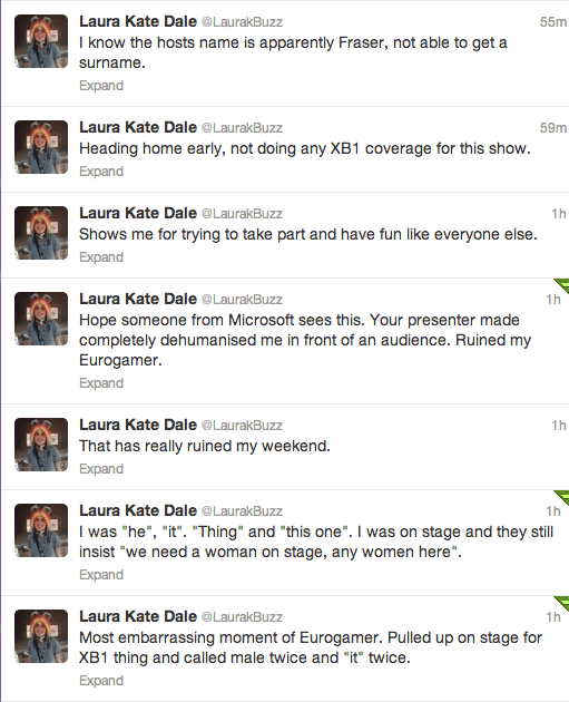 Eurogamer Expo 2013 started over the weekend with an Xbox One conference from Microsoft. British comedian Fraser Millward, who was hired as an Xbox One presenter, ridiculed Laura Dale of IndieHaven during the show, referring to her as a man, “it”, “thing” and “this one”; while Dale was on stage, the presenter insisted that they needed “a woman on stage, any woman here”. The incident was revealed to non-attendees through Dale’s Twitter account: