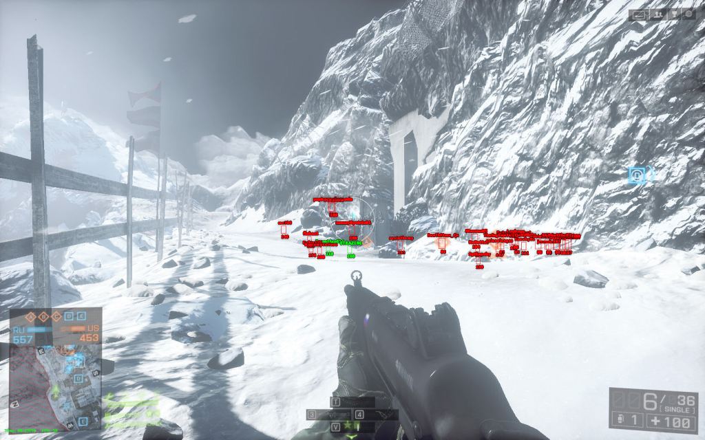 While the future updates are addressing several technical issues, one prevalent still remains across all platforms- hacking: As a warning to those with the PC version, an “aimbot” hacking package exists courtesy of ILikeCheats.com; the hack allows the user to see the “Health” status and player-names of everyone on the opposing team anywhere on the map, as they will be indicated by red text and a rectangle. In addition to what is essentially a “radar hack”, the user is also capable of ranking-up at a much faster rate than allowed; at the moment, this hack is immune to PunkBuster and FairFight….That said, proceed with caution, PC-players: