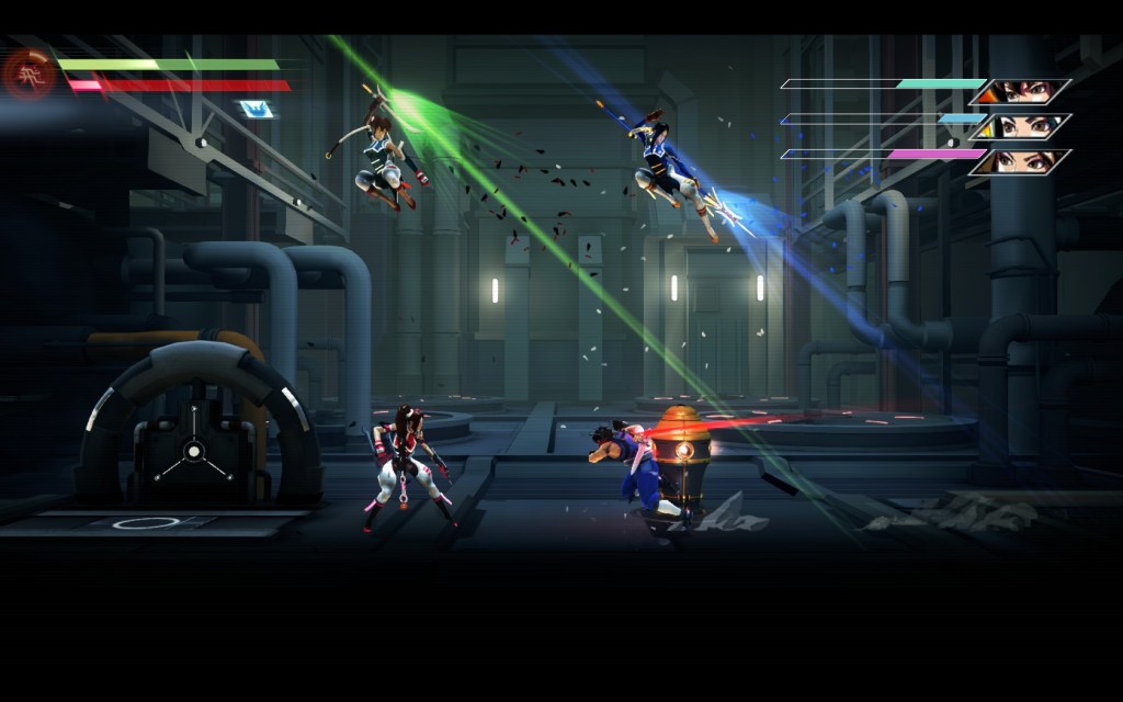 While various sources title this as Strider HD, Strider isn’t exactly a high-definition port or reskin- it’s a “re-imagining” of the original adventure. Where Strider Arcade/Genesis and Strider NES featured varied industrial and natural environments, Strider 2014 is set entirely within a city landscape, layered with a subtle rasterized visual filter to emphasize the futuristic setting: From the moment Hiryu drops in from his glider, to the not-quite-final moments of the game, players venture through all areas of the techno-industrial Kazakh City; while it lacks the Egyptian and jungle themes of classic Strider titles, players are introduced to pristine governmental architecture, dank industrial working areas, the neon-engulfed underground slums, and cybernetic research facilities to name a few. As Strider is presented in 2.5D (a game with 3D visuals, but 2D side-scrolling gameplay), background environments are fleshed out and often feature animated characters or some form of conflict within the area, adding extra depth and scale to each subsection of Kazakh City. Despite the player being in a cityscape for the primary duration of Strider, Kazakh City conveys itself as a living environment of its own, with plenty of diversity that continues to renew itself throughout the course of the game.