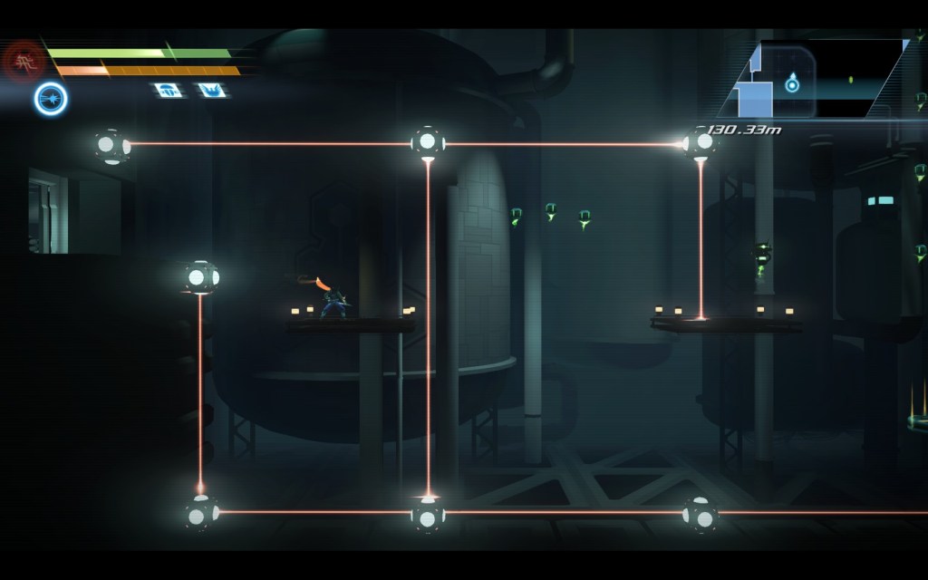 while older Strider games could be drastically simplified to the point of “run forward and slash things”, none of them were considered to be an easy-win; Strider HD is no exception. The first few moments of the game fall into the oversimplified “run forward and slash things” description, but Strider soon becomes a very challenging ordeal, pushing the player’s combat and platforming abilities to reasonable limits: Strider is difficult by design, not by chance; every hazard is presented in such a way that allows the player to assess the situation and plan a strategy to conquer said situation, whether it’s navigating a maze of lasers, or having to reflect a myriad of projectiles back at mounted turrets…while dealing with armored mechanical spiders and shielded cyborgs- there are no “cheap deaths”. Some situations and bosses can become overwhelmingly frustrating, but most conflicts have a simple solution that reveals itself over a few player-respawns; it’s worth noting that Strider is very generous with Checkpoints, as players would otherwise waste precious moments backtracking through the expansive Kazakh City.