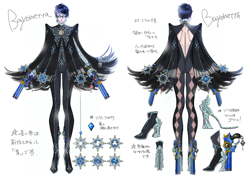 A new post from freelance designer Mari Shimizaki reveals more information regarding the style changes of both characters. The decision to give Bayonetta a different hair style was a joint conclusion made by Shimizaki, Hideki Kamiya and Yusuke Hashimoto. Reflecting her wild personality, the three decided that “Bayonetta’s not the kind of girl who’d show up with the same hairstyle for her sequel”. Her redesign was created with the theme “Solid”: Bayonetta’s original design focused on her curves and femininity, with an obvious emphasis on her legs. The new design is very geometric, using several straight edges, with the exception being her glasses, which Shimizaki “gave a slightly softer design”. While her outfit itself is still black, Director Yusuke Hashimoto requested that Bayonetta’s accents be changed to blue, in order to reflect the sequel’s theme of “water”, as it’s a “big theme of the second game”. The original outfit had a large open-back and a “cleavage window” which held her amulet; Bayonetta’s new cape closes over her chest, however the new outfit retains the open-back element, and adds a diamond-pattern opening down the back of each leg: