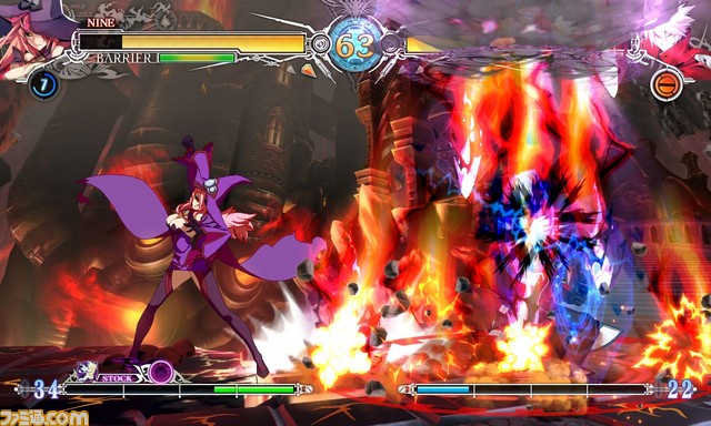 BlazBlue: Central Fiction includes the largest roster of playable characters in the franchise, drawing in original characters and those found within the BlazBlue: Remix Heart manga. Yet another new character has been added to the roster with “Nine the Phantom”. Unlike any other character in the franchise, Nine does not use Drive attacks; instead her arsenal includes elemental-based magic attacks, with the Drive button functioning as an enhanced elemental attack based on energy stocks. New screenshots courtesy of Japanese publication Famitsu show her D-function and elemental attack stock, as indicated by the “Stock” Fire icons and bar below: