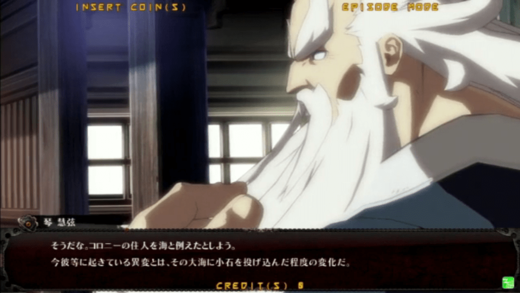 Arc System Works announced through Japanese gaming magazine Famitsu that a fifth character would be available for the console versions as DLC. Newcomer “Kum Haehyun” will be available for free within first-print copies of -REVELATOR-; the character can be purchased alternatively through PSN. While Kum Haehyun isn’t playable in the current build of the game, “he” appears during a cutscene within Leo Whitefang’s Arcade Mode. A descendant of the “mind tuners” and current leader of the Kum family, Kum Haehyun is actually a woman controlling a suit modeled after a buff middle-aged man. The Famitsu scan suggests that Haehyun will have fairly simplistic mechanics that weigh heavily on power and momentum.