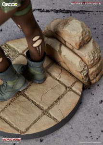 Square Enix released a Play Arts Kai collectible Quiet action figure last year, however collectible manufacturer Gecco- with partner Mamegyorai- will have their own rendition of MGSV‘s sniper, with a collectible statue expected to release sometime this Summer. The 1/6 scale “Quiet” statue stands at 11″ tall from the base to the crest of Quiet’s head, and is sculpted from ABS and PVC. The highly-detailed collectible includes two interchangeable faces- one with and one without Quiet’s active butterfly face camouflage; her knife and handgun can be removed in exchange for her rifle, which features a detachable suppressor. The display stand is inspired by the Aabe Shifap Ruins of Afganistan, the area where Venom Snake first encounters Quiet.