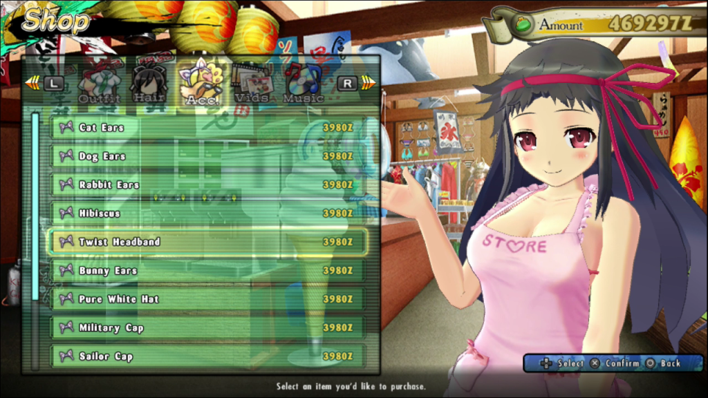 By completing the main Kagura Millenium Festival missions, players will unlock multiple items in the shop, including artwork, movies, special finishers, music, outfits and accessories for each character, of which can be customized and viewed in the Dressing Room. If the player fulfills certain requirements, being story progression or destroying a certain number of festival platforms hidden in select missions, additional Shinobi Girl’s Heart missions will be unlocked outside of the main story; Shinobi Girl’s Heart includes personalized stories for 27 characters across 135 missions. Two additional Special Missions are available, however these primarily serve as an advertisement for the Estival Versus OVA anime specials.