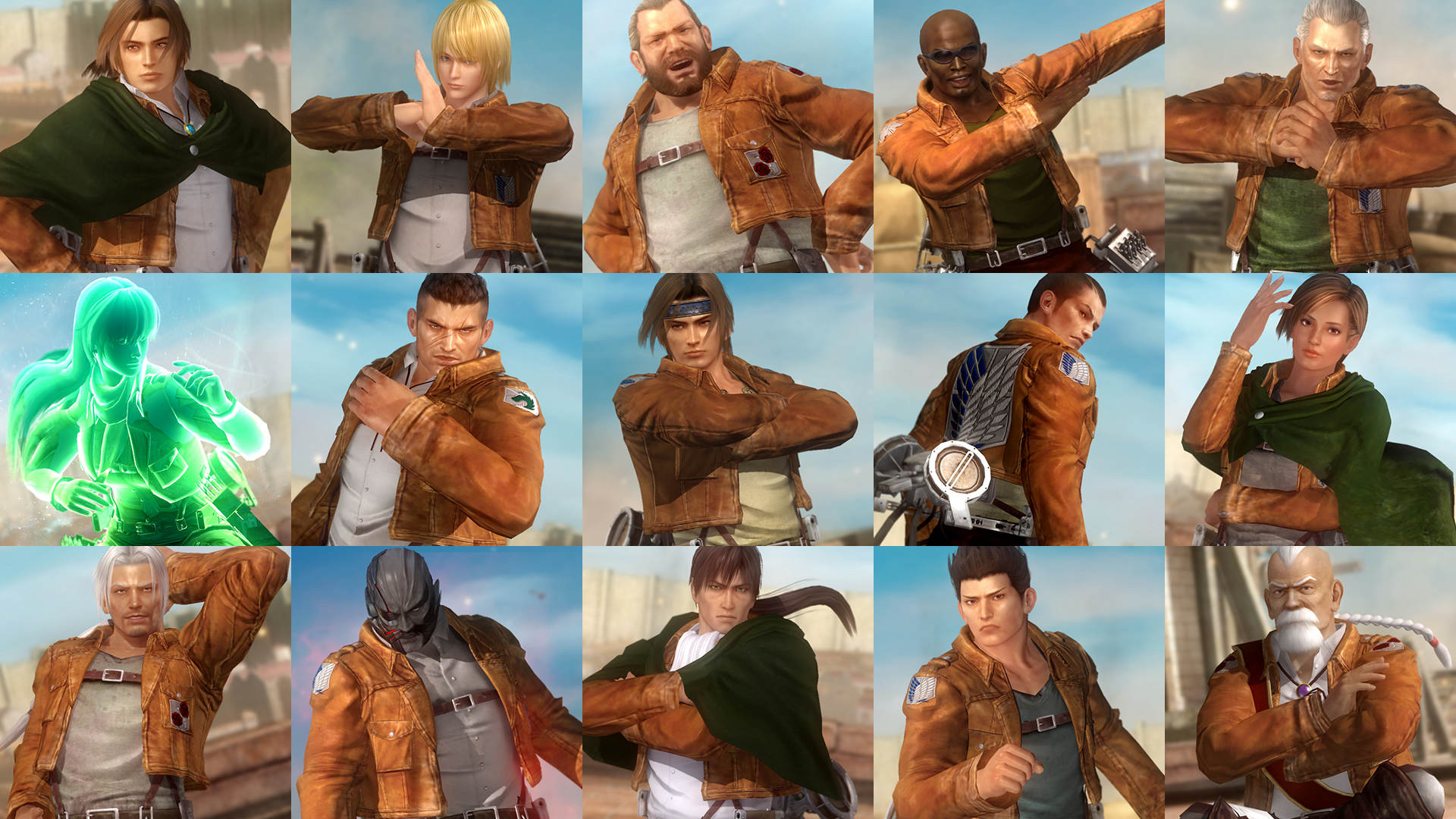 Adding to the endless DLC list is a huge Attack on Titan cross-over DLC pack, now available for the Xbox One, PS4 and PC versions of DOA5: Last Round. The “Attack on Titan Mashup” bundle includes costumes for every character, varying between the Scout Regiment, Garrison Regiment and Cadet Corps uniforms.
