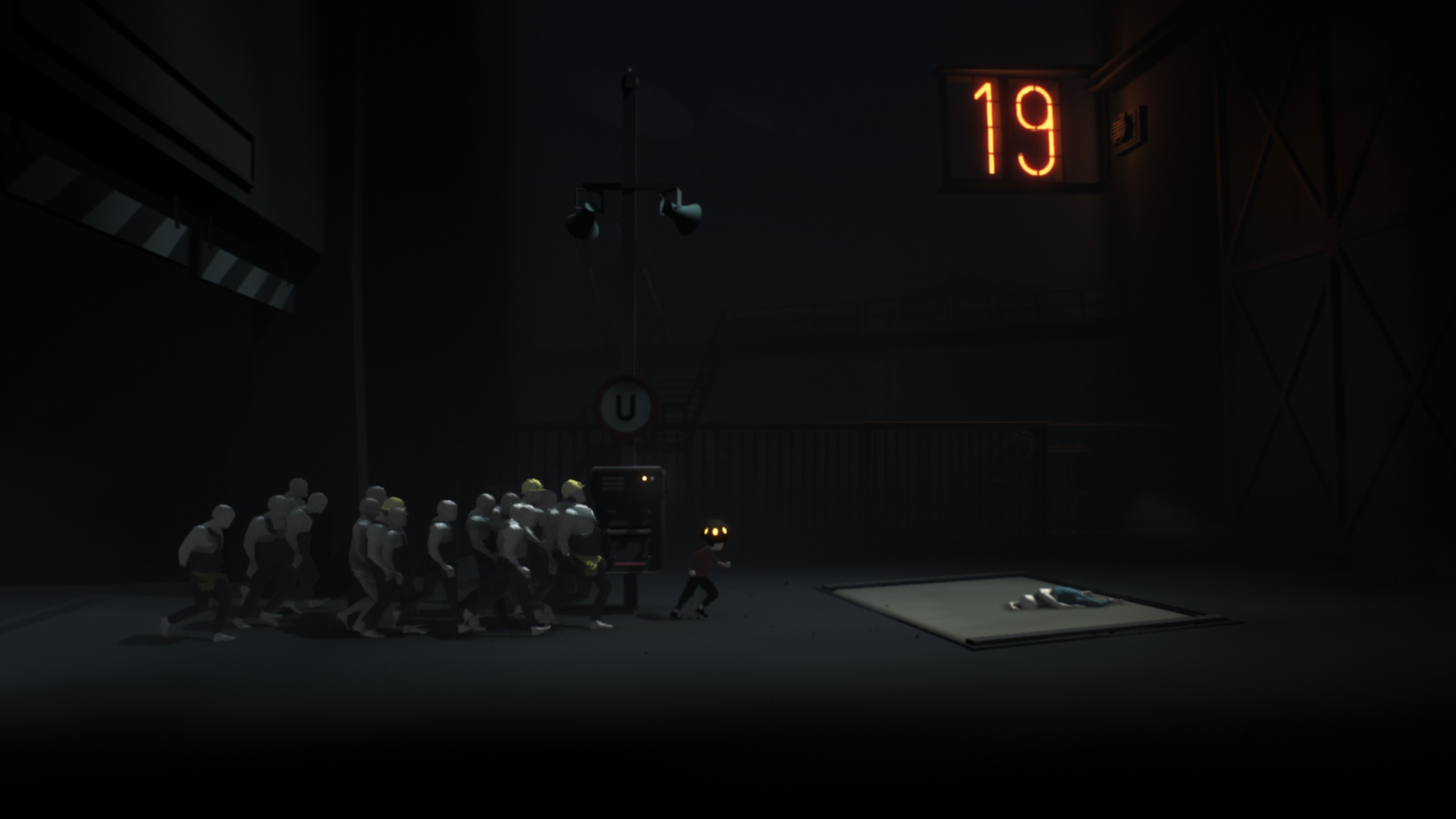 An apparent motif of Inside is the idea of “control”, as noted by the countless humans obeying the orders of robots, and the underlying suggestion that the majority of the game occurs within a titanic laboratory. This idea bleeds over into key gameplay segments where the child gains control over others through the use of a specialized helmet. When the child dons one of many yellow helmets within the facility, the controls are switched to all of the affected individuals. If a large group of people- or presumed test subjects- are mind-controlled, they function as a hive-mind capable of lifting industrial doors, moving heavy objects, or boosting the child to higher locations.