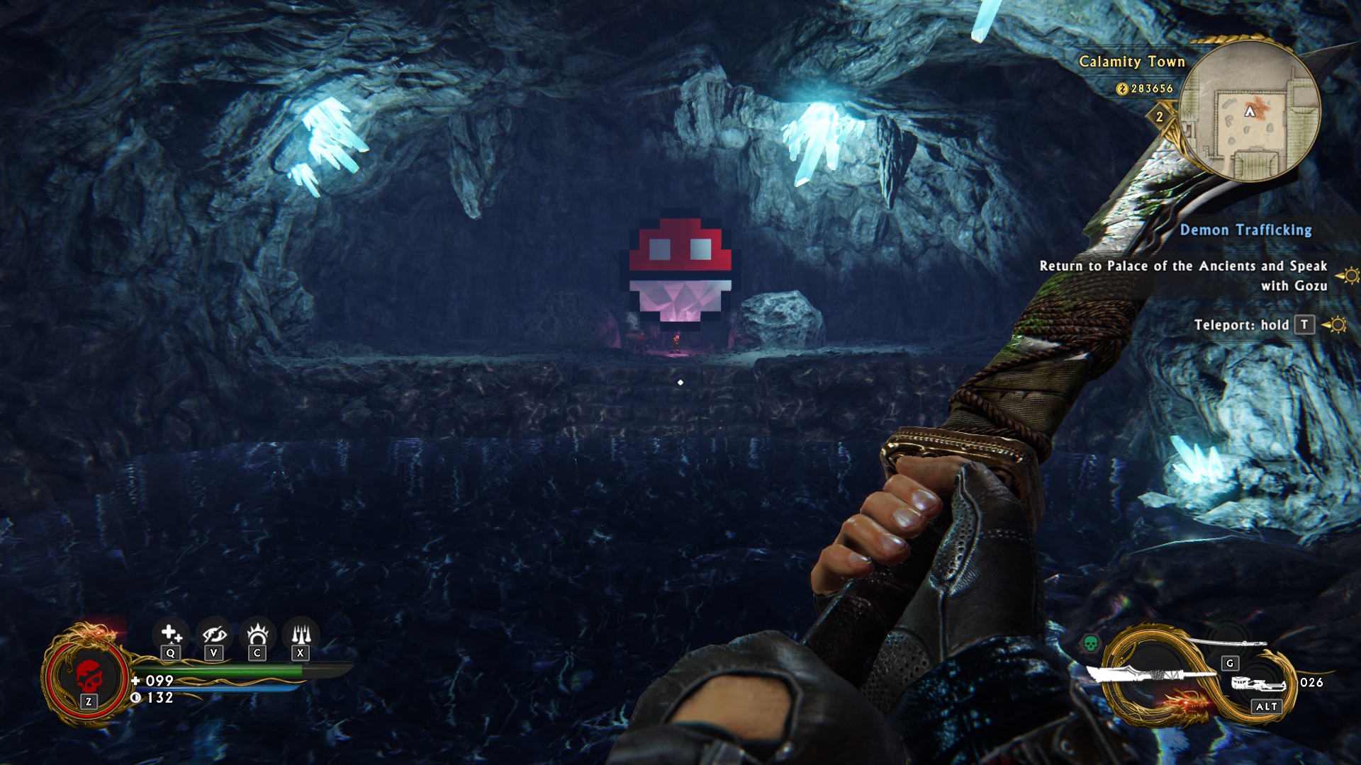 Players will find themselves spending a decent amount of time in the Wang Cave, the new central hub of Shadow Warrior 2. Lo Wang’s trashed bachelor pad, Master Smith’s cave and the surrounding shops are home to eventual quest NPCs and shopkeepers. Color-coded Quests are given from various NPCs around the area, between yellow “Main” missions and blue “Side” quests. Side missions are completely optional, however the game may suggest the player completes them due to the extra Karma boost and new weapon potential. Shadow Warrior 2 may not be an interconnected sandbox game, however players are free to explore each of the massive areas in “Free Roam” once each mission is complete; a suggested route is shown on the map, though each area can be completed in a manner of ways, locked doors and key items pending. Those willing to invest the time will uncover secret mini-bosses in each mission, hidden collectible statues, and a plethora of Easter Eggs and pop culture homages; true explorers may discover nods to the likes of other Devolver Digital and Flying Wild Hog games, Minecraft, Pokemon, and even the Harry Potter films.