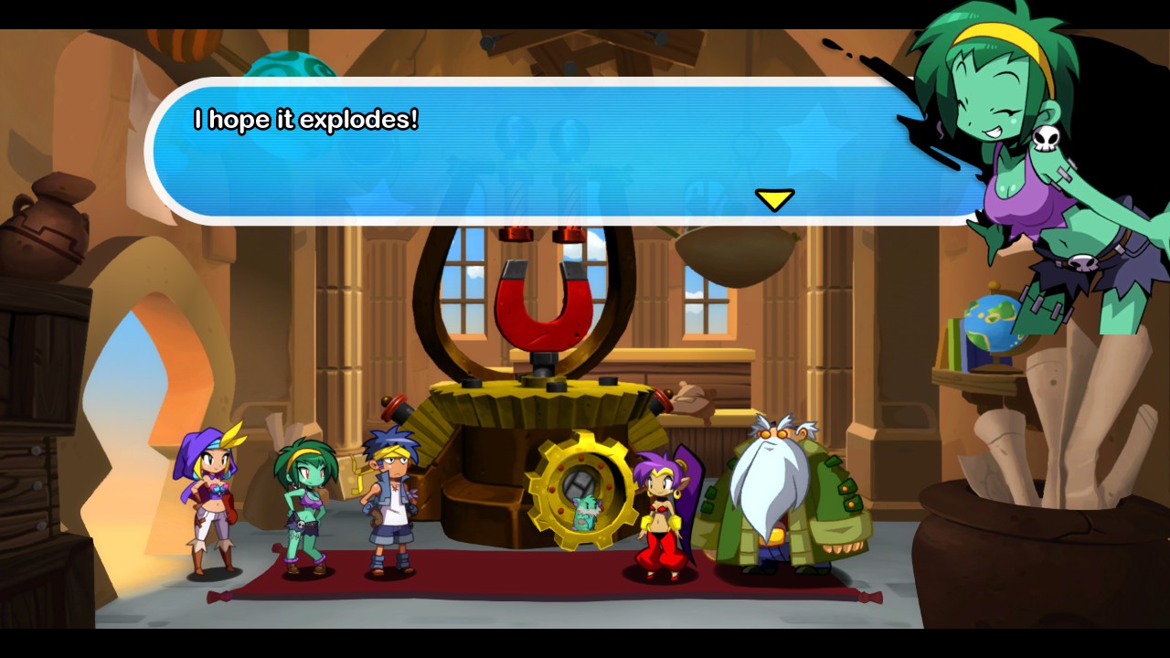 Half-Genie Hero replaces the Game Boy Color installment as the new origin story of the series: Shantae is a half-genie raised under the eyes of Uncle Mimic after the disappearance of her full-blooded genie mother. The purple-haired heroine is awakened and led to a mysterious cavern by an apparition of the Genie Realm; the formless entity warns Shantae of a coming “agent of darkness” that threatens the existence of both the human world and the Genie Realm. With news of an unseen threat on the horizon, Shantae and Uncle Mimic begin construction of the Dynamo, an electrical device from “the old world” capable of weaponizing magic. Construction comes to a brief halt when Shantae’s pirate nemesis Risky Boots launches an attack on Scuttle Town. One of Risky’s Tinkerbats swipes the Dynamo blueprints from Uncle Mimic in the ensuing chaos, only to be returned after Shantae defeats Risky and her new Tinkerslug tank-ship- the “P.O.O.P.T.O.O.T”. With Risky Boots temporarily out of the way, Shantae is free to explore the various regions of Sequin Land for the remaining components required to complete the Dynamo before the nameless evil force arrives.